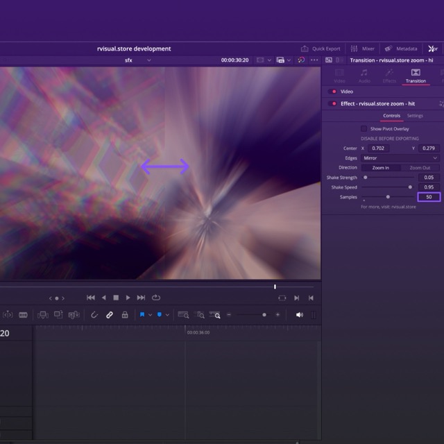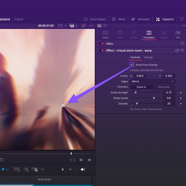 Some transitions come with a "Center" control for easy centering. To make things even easier, you can enable the pivot overlay, so you'll see exactly where you're centering the effect. Just don't forget to turn it off before you render!