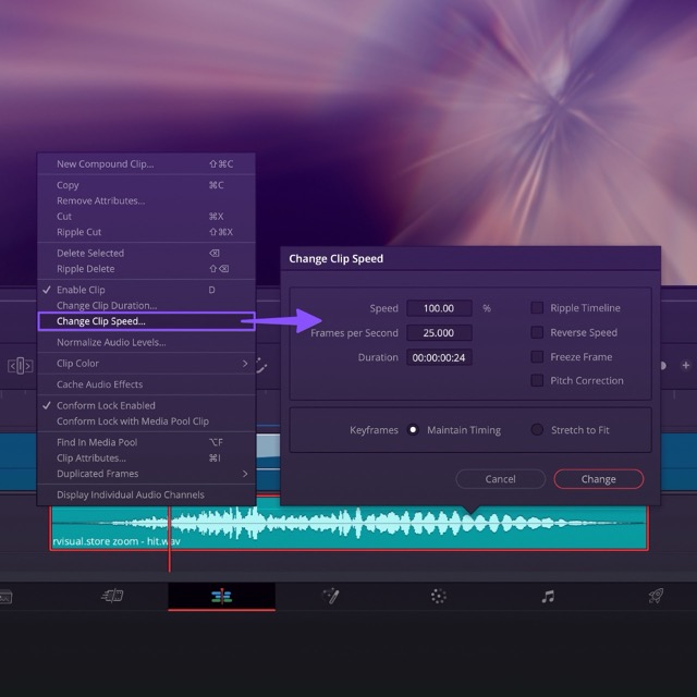 Save the sound effects from your purchased product anywhere on your computer. However, we recommend not leaving them in the Downloads folder. Add the sounds to each effect based on their name. You can easily adjust the sound length by right-clicking and selecting "change clip speed." Finally, test how the sound fits with the effect to make sure it works perfectly.